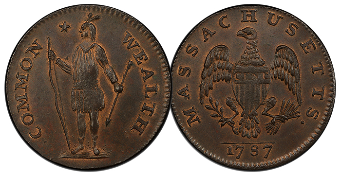 Massachusetts was late to the game when it came to striking copper coinage during the Articles of Confederation period. Its cent and half-cent issues did not appear until 1787, one year before the ratification of the United States Constitution. The Constitution gave the federal government a monopoly on producing coinage with the intention that a national coinage would increase trade amongst the states.