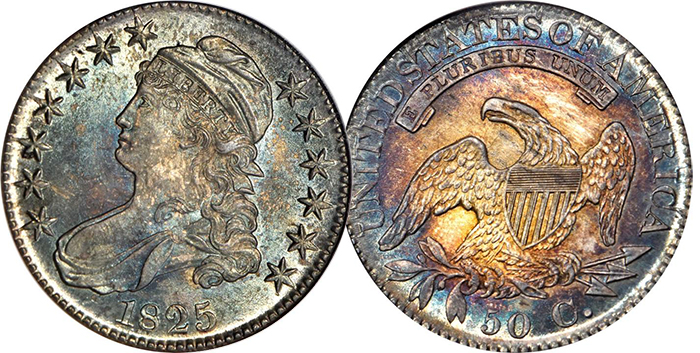 While a type coin, this colorfully-toned example graded MS67 by NGC is tied with three other coins at the top of the population report and is, according to Stack’s Bowers, the sole finest of the Overton-104 die varieties.