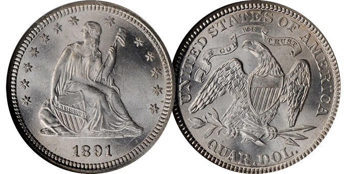 With all of this going on, the Seated Liberty design took its final bow in 1891. The quarter dollar denomination was struck at Philadelphia, New Orleans, and San Francisco. The New Orleans issue is an underrated rarity. With nearly four million struck, the Philadelphia issue is a type coin.