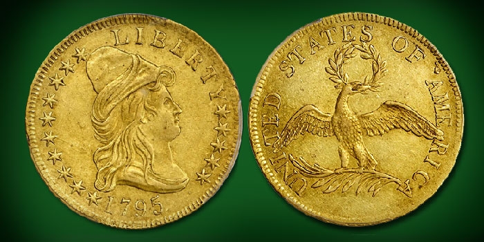 Large and impressive at 33 mm, the $10 eagle served as the largest gold denomination for the fledgling nation’s monetary system. Designed by Robert Scot, the Small Eagle reverse type was only used for three years and was replaced in 1797 by the Heraldic Eagle reverse. The number of eagles delivered in 1795 is recorded as 5,583 pieces, but this does not account for the likelihood that a significant quantity of 1795-dated coins was also made in 1796. Detailed studies by John Dannreuther indicate that the actual mintage for all 1795-dated eagles is probably between 5,859 and 10,915 coins.