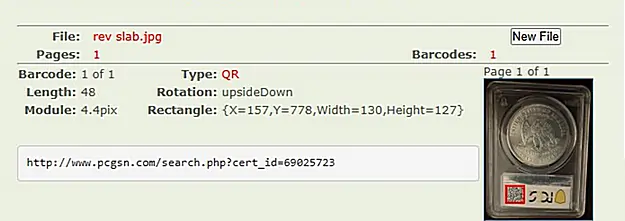 So, I started with the “PCGS” slab and some quick checks. Using my on-line barcode scanner I checked the front barcode: