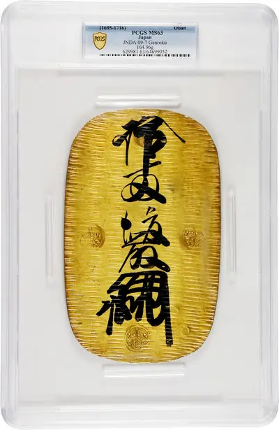 The extraordinary piece is a Genroku-era Oban (10 Ryo) certified PCGS MS-63, and it stands as the finest certified example of its era.