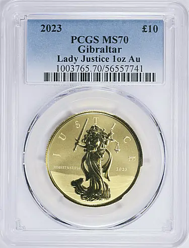 In 2023, the Scottsdale Mint delivered one of the most compelling modern gold issues on the market. The 2023 Gibraltar Gold Lady Justice £10 coin combines ultra-low mintage, a refined design, and flawless gold purity. As a result, it quickly became a centerpiece for collectors of modern world gold.