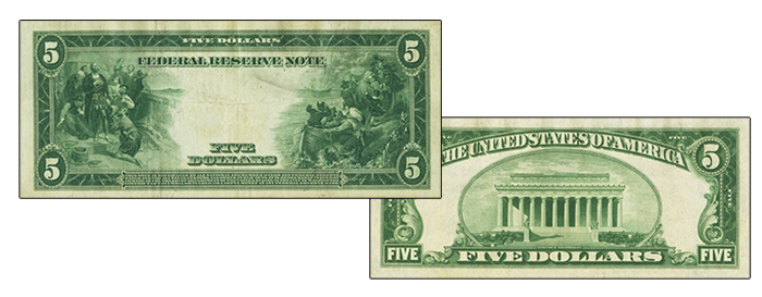 It also had a spectacular comeback on the back of the $5 Federal Reserve Note, series 1914, and on the Federal Reserve Bank Note, series 1915 and 1918 (on these notes, we see Columbus in sight of land at left, and the landing of the Pilgrims at right; the front is graced by a portrait of Lincoln)[28].