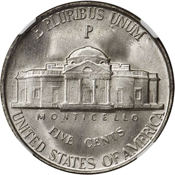 Atop the reverse is the motto E PLURIBUS UNUM (“Out of Many, One”). The name MONTICELLO–the placement of which on the coin was one of the Mint’s revisions forced upon the coin’s designer Felix Schlag–is found in a straight line immediately under the building; the positions and spacing of the other inscriptions had to be adjusted to make room for it. The denomination FIVE CENTS forms a gently curving line beneath that, and the inscription UNITED STATES OF AMERICA runs along the bottom edge of the coin. A large mintmark P appears above Monticello’s dome to identify nickels struck from the copper-silver-manganese alloy at Philadelphia from 1942 to 1945.