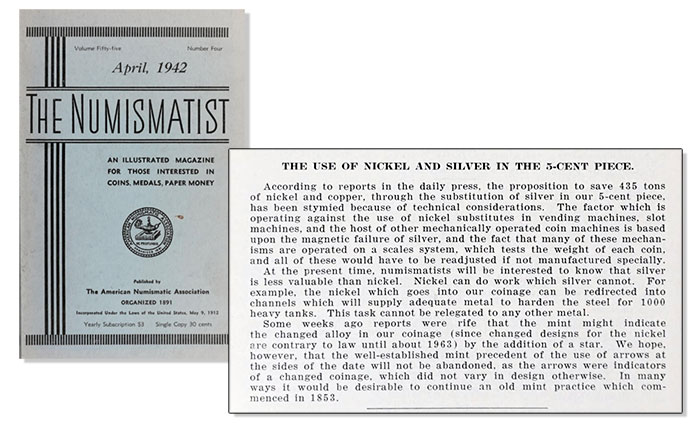 The Numismatist took note of the nickel’s changing composition in its April 1942 issue, noting that “numismatists will be interested to know that silver is less valuable than nickel. Nickel can do work where silver cannot. For example, the nickel that goes into our coinage can be redirected in channels which will supply adequate metal to harden the steel for 1,000 heavy tanks.”