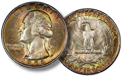 It is one of three 1959 quarters that are each PCGS-graded MS67. Even so, PCGS has graded 600 as MS66 and two as MS66+, plus 775 so far as MS65 (all as of the time of writing). In a recent internet-only sale, Heritage sold a PCGS-graded MS66 1959 for $59. Other than Mint errors, the previous Heritage auction record for a 1959 quarter was $603.75 for one that is NGC-graded MS67 and was auctioned in 2004.