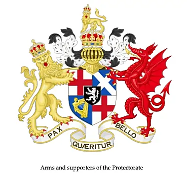 On the reverse, the arms of England, Scotland, and Ireland surround a central shield bearing Cromwell’s personal arms: a lion rampant. A crown tops the entire design.